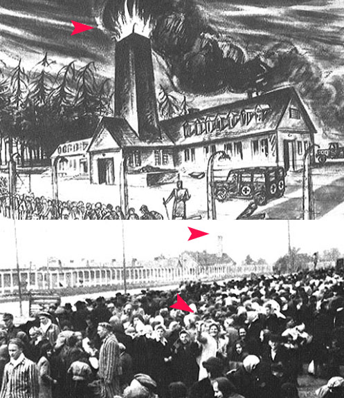 Картината по-горе е от поредният евреин, затворник в конц. лагер в Аушвиц, който е решил да свидетелства, за да може света да научи какво е ставало в конц. лагерите. Понеже една от недъгавите и научно доказано невъзможна теория е, че са палели телата в пещи на картината, която е негово дело се вижда бесен дим да излиза от комина, та направо днешните заводи пасти да ядат. Долната снимка, (а не картина!) показва същата сграда, от друг по-далечен ъгъл от който ясно се вижда, че и грам дим не излиза от нея. Обърнете внимание и на посочената затворничка. Доста щастлива ми изглежда за еврейска конц-лагеристка.