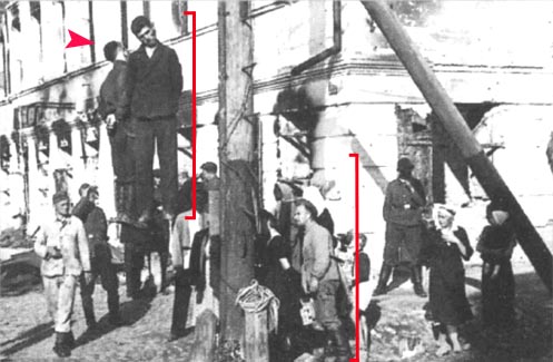 Какъв е този човек – цял великан! Вижте сравнението с човека стоящ отляво, също оразмерен с червен пречупена скобка. Между другото, забележете как висят обесените им тела – няма въжета никъде?! Доста некадърен фалшификат.