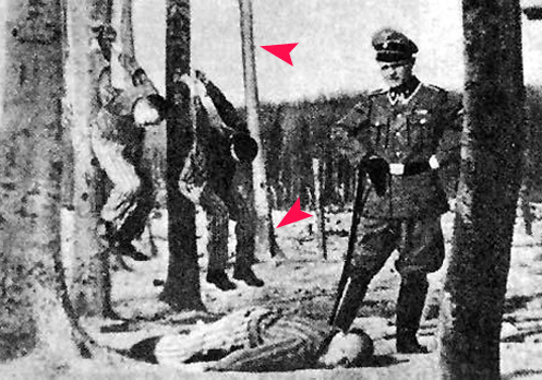 2) Всеки, който има поне грам балистични познания ще знае, че стрелянето в позиция срещу стена от толкова късо разстояние е нелепа глупост. Всички знаят, че екзекуциите чрез разстрел се извършват от войници строени срещу жертвите. По-висш от тях, офицер дава три команди – да застанат, да се прицелят и да стрелят. На снимката си личи, че това са германски войници движещи се по време на някоя битка нагласени така, че да изглеждат като разстрелващи невинните “жертви”.