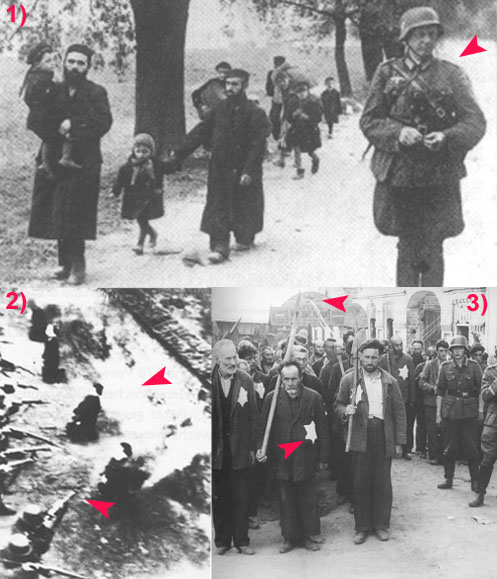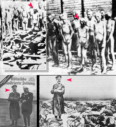 Това изображение е много показателно докъде могат да стигнат евреите в морето си от лъжи, в което се мъчат да удавят исторически грамотните хора и борещи се за истината, след което обикновеният човек няма голям избор освен да приеме това, което му се показва за истина и да се удави в морето от лъжи и той. Горе, вляво виждате оригиналната снимка на затворници в конц. лагер, момчето посочено със червената стрелкичка е преправено на доста по-слаб в снимката, която се разпространява в горният десен ъгъл. Хмм. Долу, в левия ъгъл виждате снимка на Адолф Хитлер и Гьоринг. Вдясно ясно се вижда, че същата снимка на Хитлер е преправена и натъмънена сред камара мъртви тела…