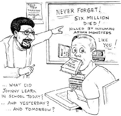 Joidenkin mielestä on tyhjänpäiväistä inttää siitä, montako koukkunokkaista rikollista mätettiin kerralla uuniin tai montako jutikkaa tasapainoili vallihaudan reunalla jossain Ukrainassa vuonna 1942, mutta silloin kun kaikista historiallisista "faktoista" holocaust on ainoa, joka tarvitsee vahvistuksekseen lakipykäliä, niin jossain on mätää. Näyttää siltä että yleissivistykseen tulee kuulua tietää, että toisen maailmansodan aikana murhattiin kuusi miljoonaa juutalaista - oletko selvillä montako valkoista e urooppalaista menetti henkensä samassa sodassa? Etkö? Mistähän se johtuu? Rupeaako haiskahtamaan siltä, kuin juutalaiset olisivat arvokkaampia kuin ne kymmenet miljoonat muut sodassa kaatuneet? Saksassa ja Itävallassa holocaustin kieltäminen on kriminalisoitu lailla tyyliin "holocaust on fakta, ei mielipide" ja sen kiistämisestä on annettu neljän vuoden mittaisia vapausrangaistuksia! Voit kyllä kiistää, ettei ainuttakaan eurooppalaista kuollut vuosien 1939 ja 1945 välillä, eikä sille tule jälkiseuraamuksia, mutta et voi avoimesti epäillä kuuden miljoonan myyttiä. Vaikka demokratia on laillistanut ajatusrikollisuuden niin totuuden ei tule säikkyä tutkimuksia. Vaikka kuinka saattaisit tuntea itsesi voittajaksi vieraillessasi Auschwitzin keskitysleirillä niin ainoa sovelias tapa asennoitua holocaust-hössötykseen on sen tyyni kieltäminen. Kansallissosialistisella Saksalla ei koskaan ollut suunnitelmaa lahdata jutikoita lajikuolemaan. Piste. Useimpien Saksalaisten mielestä jutikoiden viehätys oli voitonteossa ja kulttuurillisen elämän rappeuttamisessa. Jutikat olivat soluttautuneet joka ikiseen julkisen elämän tasoon, aina mediasta oikeussaleihin. Saksalaisten näkökulmasta oli vain luonnollista tuntea olonsa uhatuksi jutikoiden taholta. Lopullinen ratkaisu, Endlösung, koski juutalaisten rohkaisemista lähtemään maasta. Tämä tietenkin nostatti yleistä hysteriaa heidän keskuudessaan. Sillä, että Saksassa oli tuohon aikaan keskitysleirejä, ei ole mitään tekemistä Endlösung-pyrkimyksen kanssa. Näissä leireissä lusivat valtion vihollisiksi luokitellut sosiaalidemokraatit ja tottahan toki kommunistit. Toisen maailmansodan puhjettua juutalaisten asema vaihtui sen myötä, myös kansainvälinen juutalaisten unioni julisti olevansa sotatilassa, joka ei ole niin yleisessä tiedossa oleva fakta. Saksa oli kansainvälisten lakien mukaan valtuutettu vangitsemaan kaikki juutalaiset vihollisten joukkoina. Chaim Weizman, juutalaisten jehu, julisti vuonna 1939 että KAIKKI juutalaiset taistelisivat Saksaa vastaan Englannin puolella.