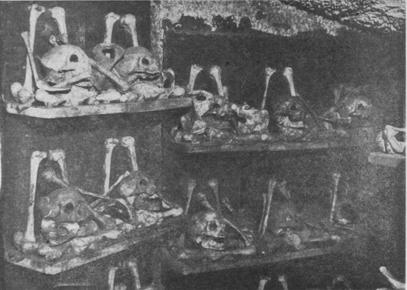 en mengde dødningehoder med ben på hyller langs veggene. Målet for vandringen er
