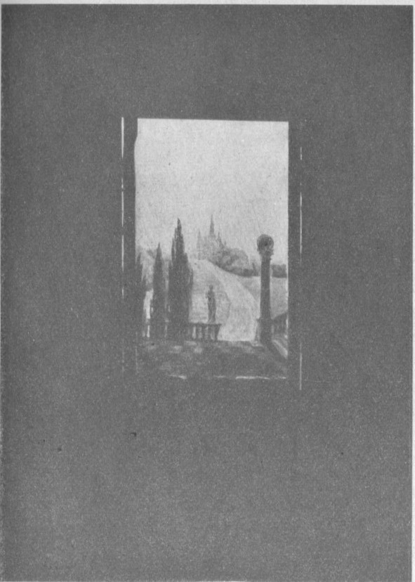 stille som i graven. Han får øye på et vakkert opplyst landskap (bildet) og går