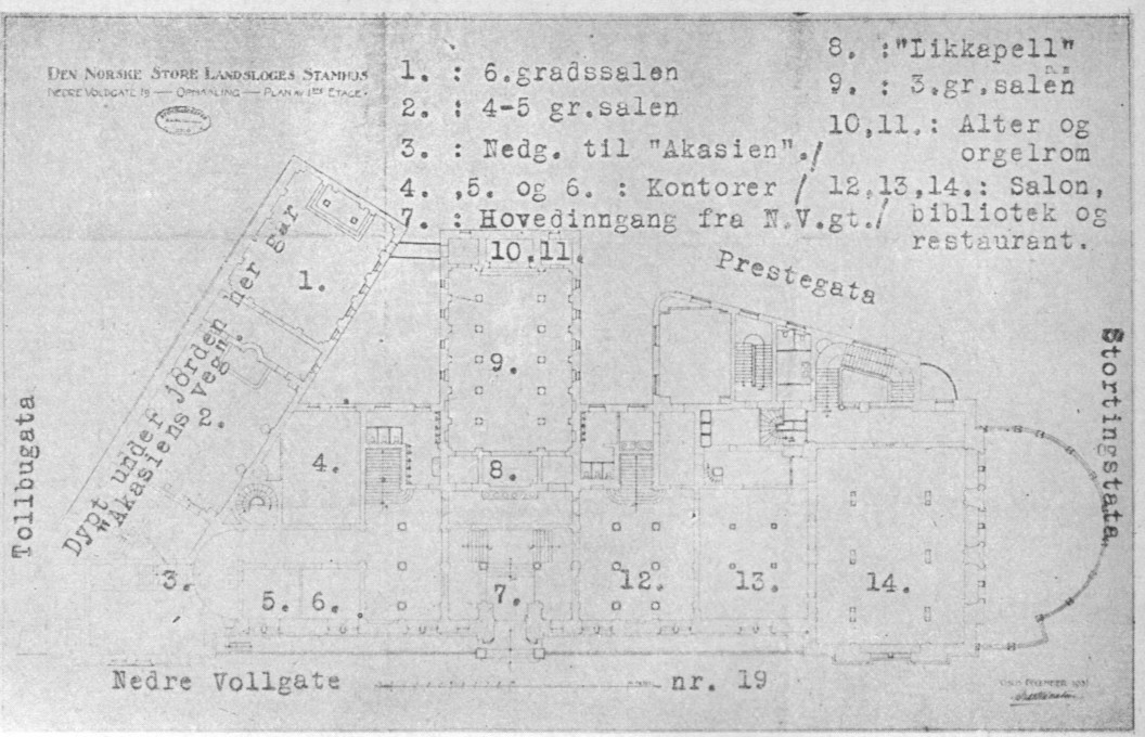 av løgn og fortielse. Den nye logebygningen i Nedre Vollgate sto ferdig i 1894