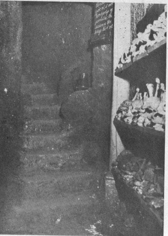 steinblokker. Langs gangen er overalt oppstilt forfalne likkister, skjeletter og