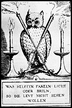 Por último reproducimos un grabado de Khunrath mencionado por von Sebottendorf. La leyenda dice “De que sirven las antorchas, la luz o los anteojos si la gente no quiere ver?” Como comenta acertadamente al respecto el H.·. Jean Mallinger "Ciertos seres aún no se hallan maduros para la Verdad; la ignoran y carecen del deseo de descubrirla. A estos ciegos voluntarios, aprisionados en las redes de la materia es en vano hablarles de la Iniciación”. Desde luego el interés primordial del grabado es que en él la I, la A y 1a O son claramente distinguibles y al mismo tiempo se hallan hábilmente ocultas para los profanos. A los HH.·. no les será difícil descubrir en las LLog.·. donde se simbolizan estos tres elementos tan especiales…